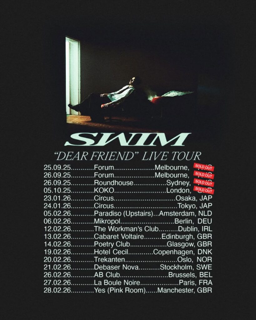 Pour la promotion de ce deuxième opus, SWIM est parti en tournée et joue un peu partout dans le monde depuis le mois de septembre dernier. Il a déjà pu se produire dans des lieux prestigieux tels que le Forum et la Roundhouse de Melbourne, le KOKO de Londres, le Paradiso d’Amsterdam, et donc très récemment l’Ancienne Belgique de Bruxelles.