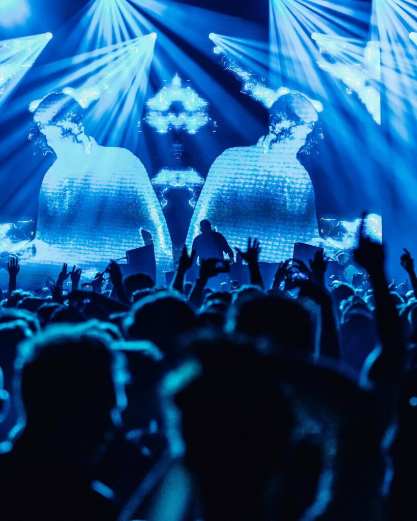 L’amorce du set est plutôt douce, axé House et atmosphère club. Les visuels, oscillant entre animations et prises de vue réelles, contribuent à cette ambiance. On ressent très vite l’esprit UK qui se dégage du concert, avec un Sammy Virji comme à son habitude très communicatif derrière les decks.
